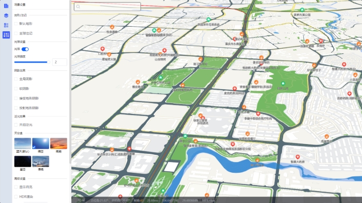 自研三维图形引擎,免插件、跨浏览器、跨平台,高精度渲染,丰富的地图交互、空间分析、特效可视化功能